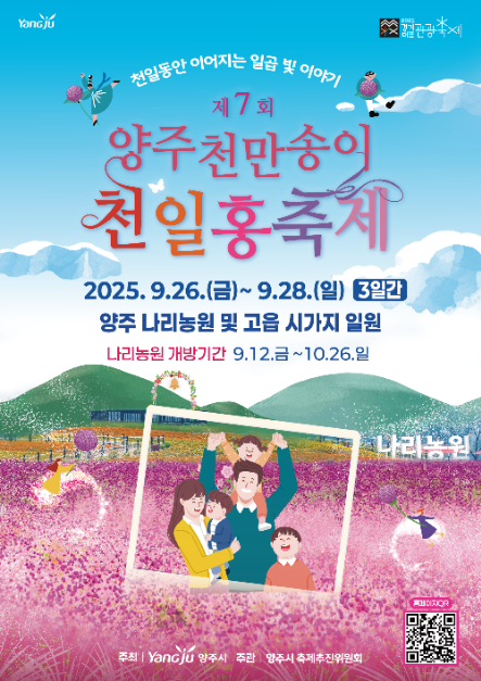 양주 천만송이 천일홍 축제는 일명 ‘글로브 아마란스(Globe Amaranth)’라 불리는 천일홍을 주인공으로, 가을 정원의 컬러 팔레트를 한자리에 펼치는 대표 플라워 페스티벌입니다. 2025년 축제는 9월 26일(금)부터 9월 28일(일)까지 사흘간 진행되며, 무대는 경기 북부의 꽃 명소 양주 나리농원. 축제 슬로건은 “천일동안 이어지는 일곱 빛 이야기”—빨강·분홍·보라·하양·연보라·핫핑크·버건디 등 다채로운 색의 천일홍마다 서로 다른 꽃말을 담아, 사랑·우정·행운·치유의 메시지를 전합니다.